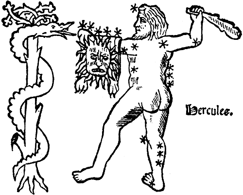 ![]() Рис. 88. Созвездия Геркулес и Змий. Из книги Радинуса (Th. Radinus: Sideralis Abyssus) 1511 г. Книгохранилище Пулковской обсерватории. |