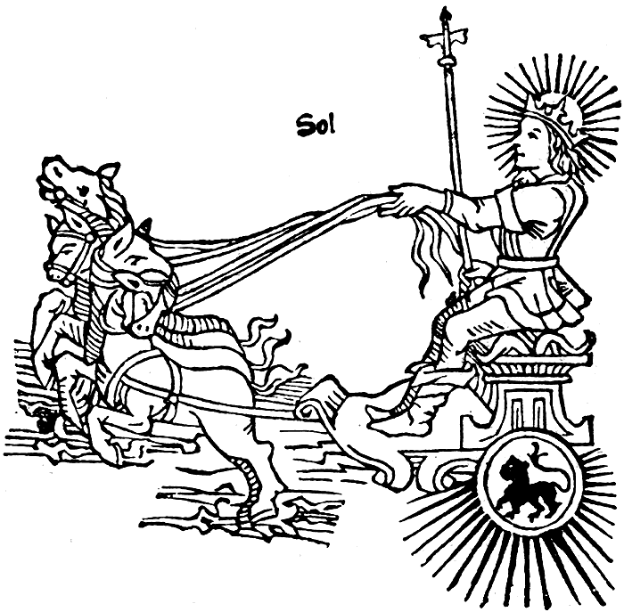 ![]() Рис. 89. Колесница Солнца. Из книги Леопольда (Leopoldi compilatio de astrorum scientia) 1489 г. Книгохранилище Пулковской обсерватории. |