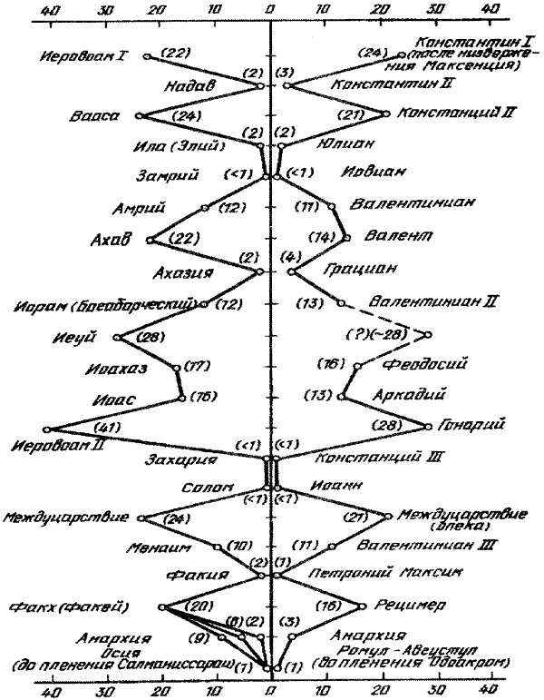 Для длительности правления Константина мы в гл. 6 зафиксировали три варианта: в 31 год с началом в 306 г. (формальное провозглашение августом), в 24 года с началом в 313 г. (утверждение власти на Западе с Лицинием на Востоке) и в 13 лет с началом в 324 г. (после смерти Лициния). По событийным аналогиям мы должны здесь принять вариант в 24 года. Его практическое совпадение с длительностью правления Иеровоама является еше одним, независимым подтверждением аналогии.
