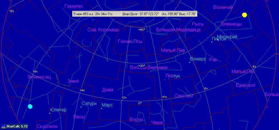 В ночь на 24/1—453 г. в Скорпионе (находящемся у ног Змеедержца) сошлись, как и сказано у «Захарии», Сатурн, Юпитер и Марс, причем Юпитер и Сатурн сошлись вместе (между ними было не более 1°). Луна в это время переходила из Скорпиона в созвездие Стрельца, быстро удаляясь от этих планет. Марс пятился к югу, а пара Юпитер—Сатурн шла к северу. Все эти подробности точно описаны Захарией: «Вороные кони там выходят к стране северной, и белые идут за ними, а пегие (по-видимому, надо читать рыжие — Авт.) идут к стране полуденной» (Зах., VI, 6). Где были Венера и Меркурий? Они не описаны в тексте, и, действительно, находились далеко от предыдущей, замечательной группы планет: Венера была в Водолее (за три созвездия), и Меркурий — в Козероге.