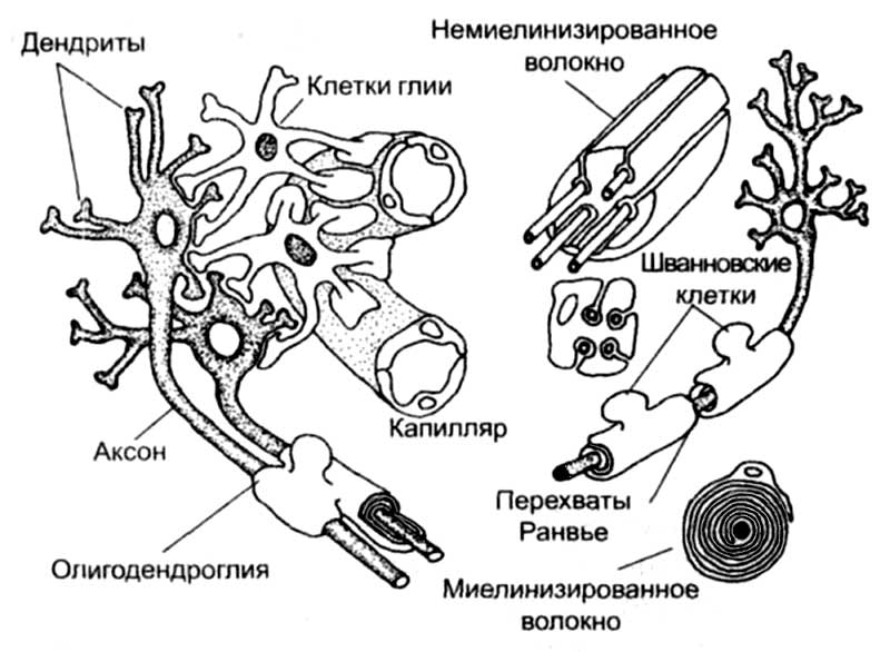 У нервных клеток — нейронов — обычно можно выделить три характерные области: клеточное тело, дендриты и аксон (рис. 1). Тело содержит ядро и биохимический аппарат синтеза молекул, необходимые для жизнедеятельности клетки. Обычно тело нейрона имеет округлую, веретеновидную или пирамидальную форму. Дендриты представляют собой тонкие отростки, которые многократно ветвятся в непосредственной близости от тела клетки. Вокруг него образуется ветвистое дерево. Дендриты формируют ту основную физическую поверхность, на которую поступают идущие к данному нейрону сигналы. Аксоны распространяются далеко от тела клетки. Их длина варьирует от 1 мм до 1 м, что позволяет аксонам выполнять функции линий связи между телом клетки и далеко расположенным органом-мишенью или отделом мозга. По аксону проходят сигналы, генерируемые в теле данной клетки. Аксон отличается от дендритов как по строению, так и по свойствам своей наружной мембраны. Большинство аксонов длиннее и тоньше дендритов и имеет отличный от них характер ветвления. Отростки дендритов в основном группируются вокруг клеточного тела, тогда как отростки аксонов располагаются на конце волокна, в том месте, где аксон взаимодействует с другими нейронами или органами-мишенями.