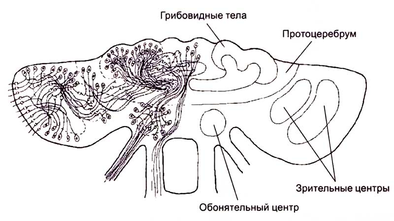 У членистоногих обнаружена сегментация мозга, вызванная появлением специализированных отделов, в которых происходит переработка информации, получаемой от сенсорных органов. У насекомых с хорошо развитым мозгом протоцеребрум получает информацию от глаз, дейтоцеребрум — от антенн с развитыми хеморецепторами, а тритоцеребрум — от передней части пищеварительного тракта. Наиболее важным результатом цефализации нервной системы является возникновение грибовидных тел, которые расположены в про-тоцеребруме членистоногих и некоторых высших червей. Грибовидные тела, по-видимому, участвуют в интеграции информации, поступающей от различных сенсорных систем. Они крайне сложно организованы. В шляпке грибовидного тела насекомых может располагаться от 3 до 12 слоев нейронов, размеры которых не превышают 2—3 мкм. Ножка грибовидного тела состоит из входящих и выходящих из шляпки волокон (рис. 10).