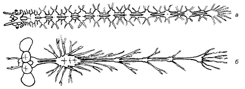 Для этой обширной группы животных характерно наличие по всей длине тела конечностей, которые иннервируются парными ганглиями, организованными в брюшную нервную цепочку. В головной части нервные клетки объединены в крупные ганглии, называемые мозгом. У этих животных головной мозг выполняет основные и незаменимые функции по интеграции жизнедеятельности организма. Развитие головного мозга членистоногих явилось результатом длительной цефализации нервной системы. Цефализация — увеличение размеров нервных центров в головной части животного — обусловлена концентрацией сенсорных органов на переднем конце тела червей, членистоногих и сходных с ними животных (рис. 9).