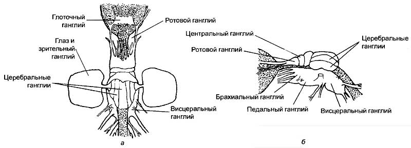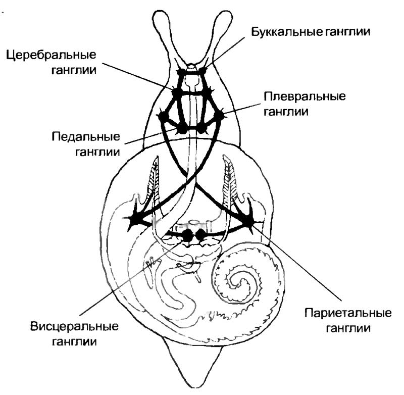 Наиболее типично организована нервная система у брюхоногих моллюсков (см. рис. 12). Головная часть нервной системы брюхоногих моллюсков состоит из четырех пар головных ганглиев, которые сгруппированы вокруг пищевода. Парные ганглии соединяются между собой комиссурами, а с ганглиями, расположенными вдоль оси тела, — коннективами, как у червей и членистоногих. Буккальный ганглий иннервирует рот и передний отдел пищеварительного канала, церебральный — глаза и щупальца, плевральный и педальный — «ногу». Отдельно расположены абдоминальный ганглий, иннервирующий органы висцерального мешка, и генитальный ганглий, лежащий вблизи органов размножения. Несмотря на простоту организации нервной системы брюхоногих моллюсков, они способны обучаться — вырабатывать условные рефлексы на внешние воздействия. Например, морской заяц (Aplysia) при длительной стимуляции жаберной пластинки и хвоста способен выработать кратковременный условный рефлекс, сохраняющийся несколько часов. Специальная программа обучения, приводящая к структурным изменениям нервной системы, позволяет возникнуть долговременной памяти, которая поддерживает выработанный навык в течение нескольких недель.