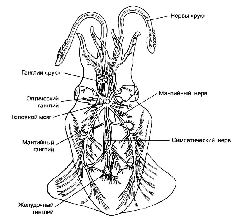 Головные ганглии нервной системы осьминога сосредоточены, как и у других моллюсков, вокруг пищевода (см. рис. 14). Ганглии увеличены, а поперечные комиссуры сильно укорочены. Слияние головных ганглиев приводит к формированию крупного мозга. Из органов чувств наибольшее развитие получили глаза. Нервные клетки специализированных зрительных долей мозга имеют различную морфологическую структуру, нехарактерную для остальных беспозвоночных, что указывает на использование зрительных центров в качестве ассоциативных областей. Крупными долями мозга осьминога являются брахиальные и педальные узлы, управляющие головными щупальцами и ротовой воронкой. Висцеральные ганглии иннервируют внутренности и содержат в себе автономный дыхательный центр с обособленной локализацией субцентров вдоха и выдоха. Буккальные ганглии определяют работу ротового аппарата. Сложность манипуляций, выполняемых щупальцами осьминога, не уступает способностям к манипулированию у хоботных (слонов) и человекообразных обезьян. Это достигается в результате интегративной работы центральной части мозга, контролирующей всё поведение осьминога. Однако центральные мозговые ганглии не являются однородным образованием.