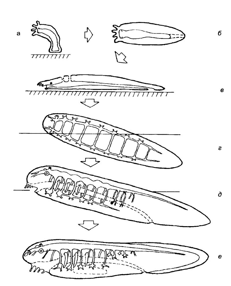 в — придонное билатерально-симметричное животное с дорсальным жаберным аппаратом;