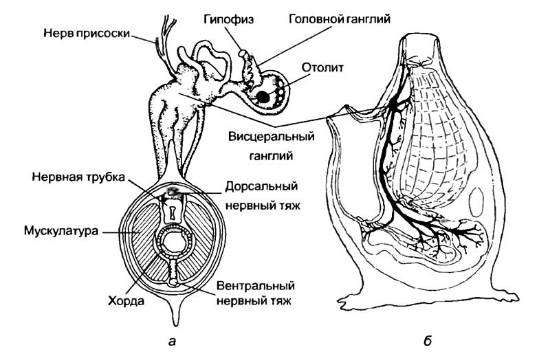 У наиболее низкоорганизованных хордовых можно заметить признаки организации нервной системы, сближающие их как с позвоночными, так и с беспозвоночными животными. Бытует несколько точек зрения на возникновение хордовых, которые имеют равные права на существование. Наиболее известны гипотезы возникновения хордовых от членистоногих, паукообразных, немертин, кольчатых червей, иглокожих, гребневиков и кишечнодышащих (В. Шимкевич, 1907; Р. Гессе, 1913; А.Н. Северцов, 1914; Н.А. Холодковский, 1914; В.Н. Беклемишев, 1944; Р.А Ливанов, 1955; Н. Kuhlenbeck, 1967; R. Jefferies и D. Levis, 1978; R. Norchcutt и C. Gans, 1983; А.В. Иванов, 1976, 1991; В.В. Малахов, 1977, 1980, 1991; Р. Кэрролл, 1992). Все эти теории с разной степенью доказательности отвечают на один вопрос о механизме возникновения трубчатой нервной системы позвоночных из ганглиозной нервной системы беспозвоночных. Рассмотрим наиболее логичную, с моей точки зрения, последовательность преобразования нервной системы в процессе эволюционного формирования хордовых. Допуская, что кишечнополостные являются безусловными предками основных групп животных, мы получим гипотетическое существо, изображенное на рис. 15,б, 16,а. Внутри животного проходит пищеварительный канал, который представляет собой гастро-васкулярную полость кишечнополостных, открытую спереди ротовым отверстием. У этого организма еще нет билатеральной симметрии, и он мог представлять собой какого-либо гидроида, перешедшего к свободноподвижному образу жизни. Он мог свободно перемещаться в трехмерной водной среде за счет сокращений щупалец, всего тела или пассивно, вместе с током воды. Основным результатом перехода к такому образу жизни стало появление окологлоточного нервного кольца.