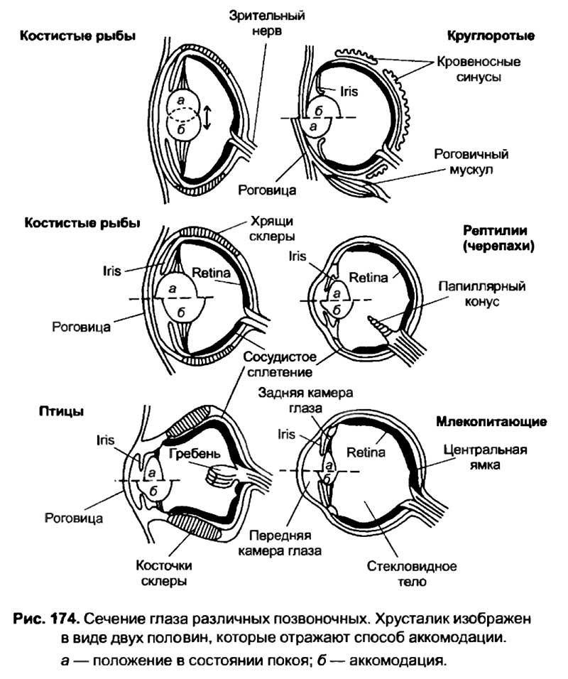 В жизни большинства головоногих моллюсков принципиальную роль играет зрение. Их глаза очень похожи на глаза позвоночных животных. У них есть роговица, радужная оболочка, сетчатка и хрусталик. У моллюсков наведение на резкость осуществляется за счет приближения или удаления хрусталика от сетчатки. Аналогичным образом происходит аккомодация хрусталика у анамний и змей (см. рис. 174). В области оптимальной зрительной чувствительности у каракатиц на один квадратный миллиметр приходится 150 000 зрительных рецепторов, тогда как у человека — только 65 000. Среди моллюсков наилучшее зрение имеет осьминог. Осьминог обладает некоторыми особенностями восприятия зрительных стимулов, поскольку он имеет горизонтально-щелевой зрачок и страдает астигматизмом. Эти анатомические особенности глаза приводят к тому, что осьминоги лучше различают вертикальные решетки, немного хуже — косые и хуже всего — горизонтальные (W.R.A. Muntz и J. Gwyther, 1989). Разрешающая способность глаз головоногих моллюсков сопоставима с таковой млекопитающих. Столь совершенное зрение позволяет осьминогам различать предметы различной формы при одинаковых размерах. У них после 3—4 предъявлений вырабатываются устойчивые рефлексы на сложные зрительные стимулы, подкрепляемые пищей. Головоногие способны к переделкам навыков, которые заключаются в использовании предварительно выработанных условных рефлексов для решения новых экспериментальных задач.