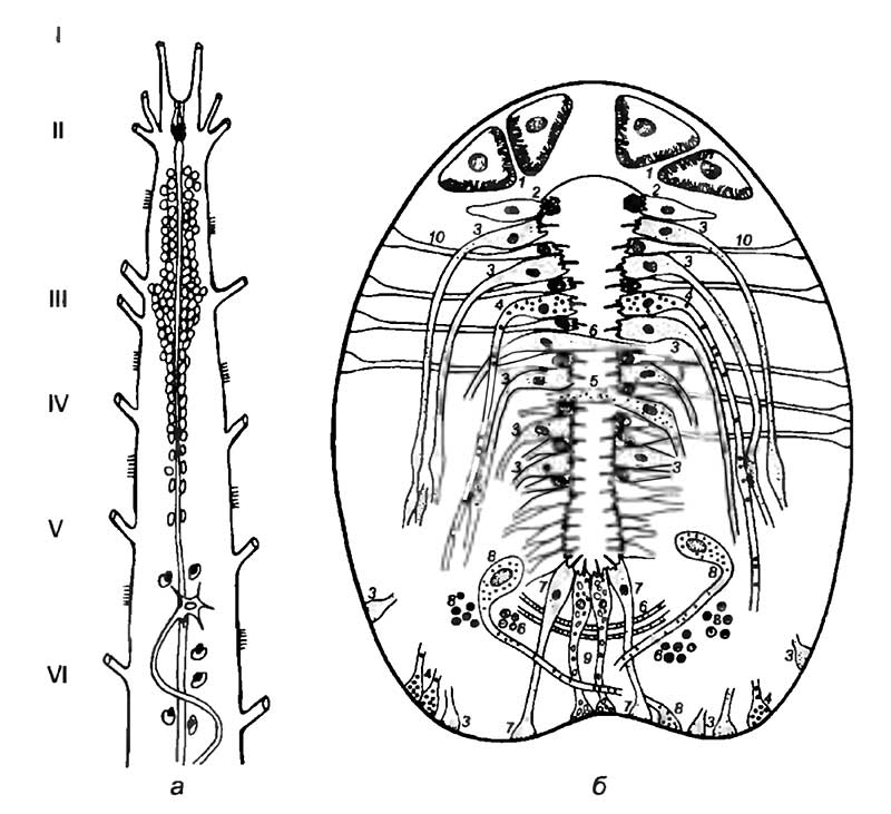 Для червей характерна билатеральная симметрия. Это означает, что у червеобразных есть хорошо выраженный передний (головной) и хвостовой концы тела и сагиттальная плоскость, которая разделяет их на две более или менее симметричные половины тела. Наличие переднего конца тела, определяющего направление движения червя, привело к концентрации рецепторных нервных элементов в относительно небольшом участке тела — головной зоне. У большинства червей на головном конце тела имеется группа вкусовых клеток и светочувствительных элементов. Отростки этих клеток оканчиваются в головных скоплениях нейронов, носящих название ганглиев (рис. 7).