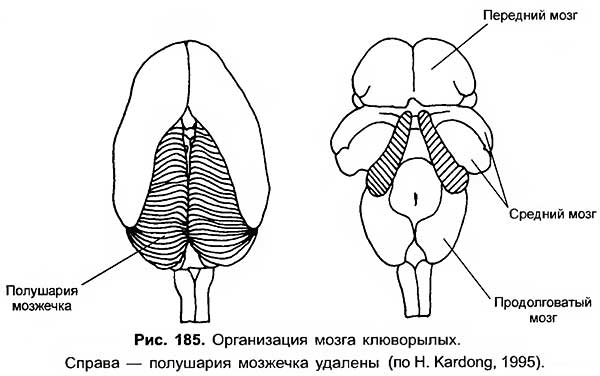 Задний мозг млекопитающих хорошо развит и имеет крупный мозжечок. В отличие от рептилий мозжечок млекопитающих состоит из трех частей: центральной части, или червя, и двух боковых полушарий. У сумчатых, грызунов и насекомоядных размер червя не уступает каждому из полушарий, тогда как у приматов и хищных по размерам доминируют полушария мозжечка. Нужно подчеркнуть, что мозжечок не является ни сенсорным, ни моторным образованием. Он стоит в стороне от главных входных и выходных путей и служит структурой, координирующей двигательную активность с нервной деятельностью других отделов головного мозга.