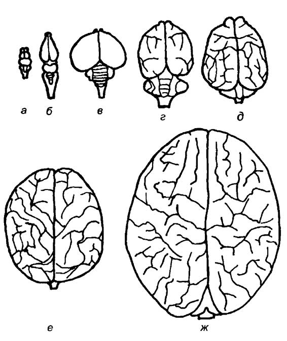 По-видимому, нервная система позвоночных возникла из ганглиев беспозвоночных с нейропилем из переплетенных отростков (см. рис. 5,е). Трубчатая нервная система сформировалась в результате выхода отростков нейронов из внутренней полости ганглия (см. рис. 5,е,з). Это событие привело к формированию нейропиля из отростков нервных клеток с наружной стороны нервной трубки. На следующем этапе формирование новых нервных центров происходило преимущественно вокруг желудочков. Это привело к возникновению центрального серого вещества. Часть клеток выселялась из прижелудочковой зоны и формировала структуры ядерного или стратифицированного типа во внешнем нейропиле (рис. 5,и,к). У высших позвоночных центральное серое вещество практически отсутствует, а основные нервные центры мозга представлены сложными ядрами и корковыми структурами различных типов. В дальнейшем цефализация позвоночных развивалась по принципу количественного наращивания анатомического представительства анализаторных систем и ассоциативных центров. В отличие от беспозвоночных нервная система трубчатого типа при наличии замкнутой кровеносной системы может бесконечно увеличиваться в размерах. Это позволило позвоночным достигнуть крайне высокого уровня развития умственных способностей.