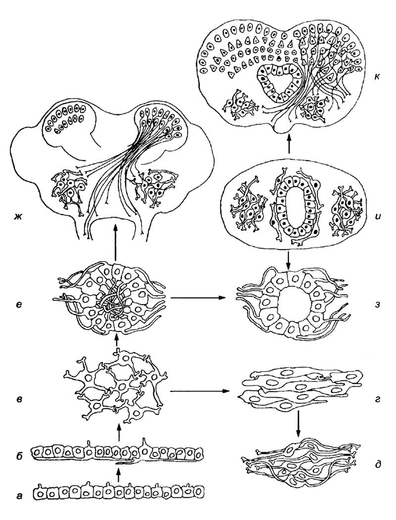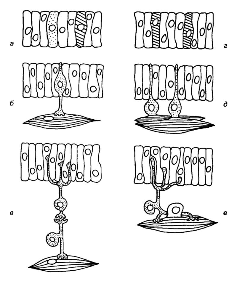 Другая точка зрения на происхождение нервных клеток сформировалась в работах Клейненберга и Заварзина (Н. Kleinenberg, 1872; А.А. Заварзин, 1941). Ее суть сводится к тому, что нервная и мышечная системы рассматриваются как единое и нераздельное целое. Считается, что обе системы возникли одновременно в виде такого образования, которое не имело дифференцированных мышечных и нервных компонентов С точки зрения этой гипотезы первичными были клетки, выделившиеся из эктодермы и обладавшие как нервными, так и мышечными функциями (рис. 2,г,д). Часть клетки обладала способностью к чувствительности, а другая — к сокращению. В гипотезе подчеркивается первичность морфофункциональной связи между нервными и мышечными клетками. В дальнейшем, по мнению авторов, произошла дифференциация чувствительно-сократимых клеток на чисто сенсорные и моторные, а общность их происхождения стала основой нервно-мышечных взаимодействий (рис. 2,е).