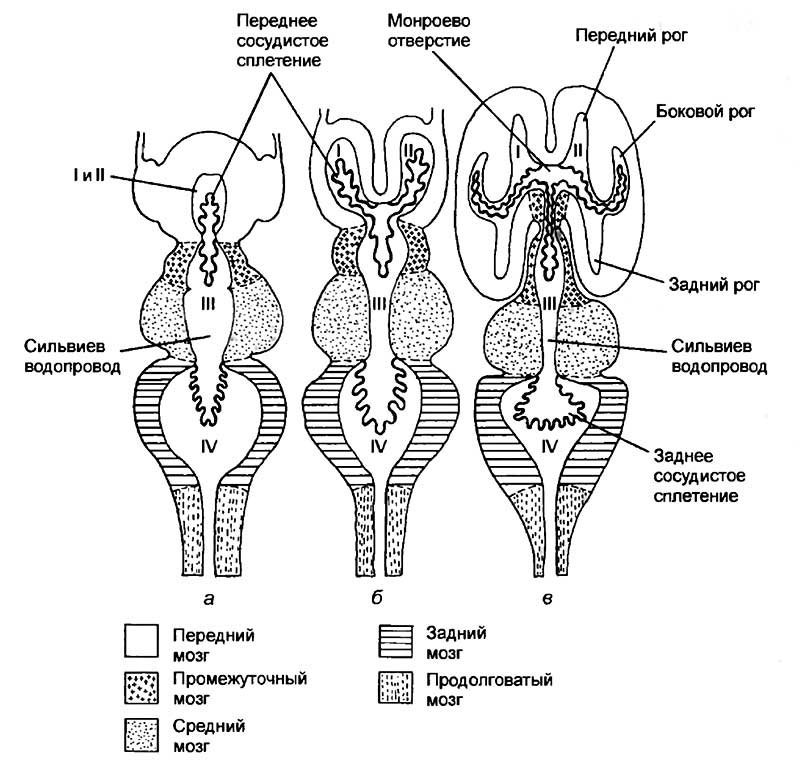 Внутри головного мозга находится сложная система мозговых желудочков. Полость спинного мозга переходит в ромбовидную ямку продолговатого мозга, которая носит название IV мозгового желудочка. Его передний край прикрыт у большинства млекопитающих мозжечком. Кпереди от мозжечка IV желудочек переходит в сильвиев водопровод — канал, проходящий под средним мозгом и ведущий в III желудочек. III желудочек представляет собой довольно узкое пространство между внутренними стенками промежуточного мозга. Спереди через монроевы отверстия он сообщается с двумя боковыми желудочками. I и II желудочки лежат внутри полушарий переднего мозга. Впереди III мозгового желудочка вследствие местного срастания полушарий вокруг треугольного пространства образуется так называемый пятый мозговой желудочек. Этот мозговой желудочек свойствен только млекопитающим.