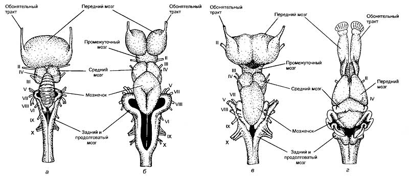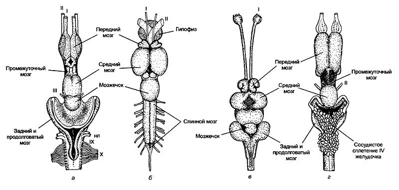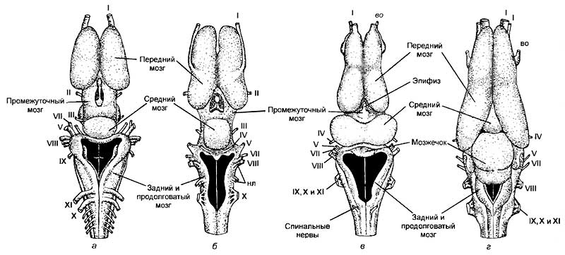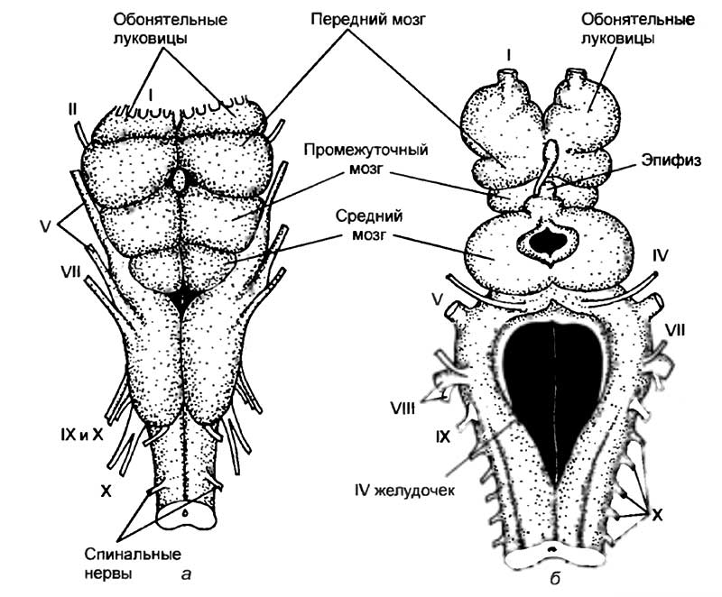 I-X — черепно-мозговые нервы, зачернен IV желудочек, нл — нерв латеральной линии.