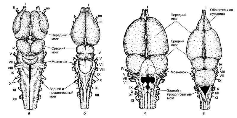 I—XII — черепно-мозговые нервы, зачернен IV желудочек, во — вомероназальный нерв.