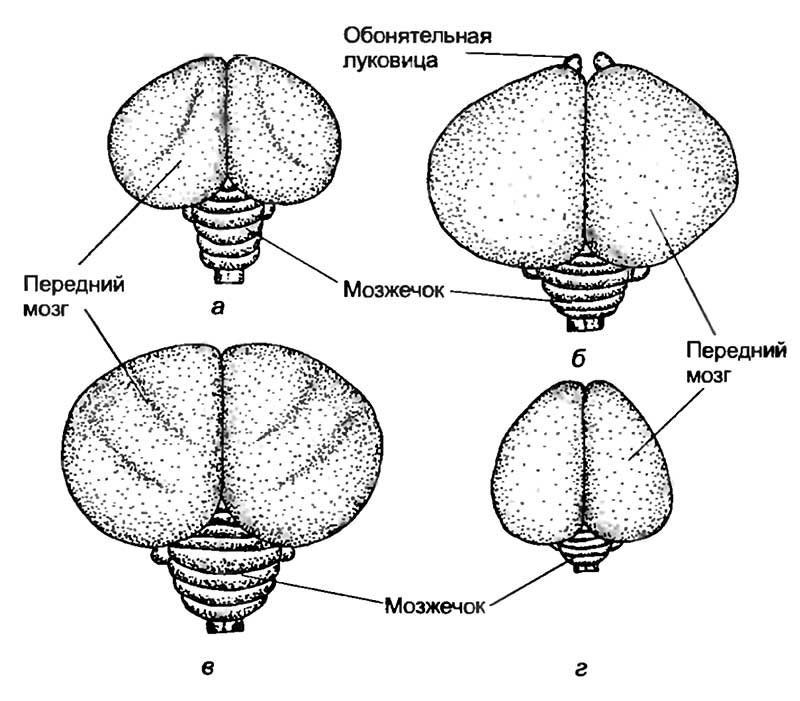 У двулегочников более сложная биология, которая включает в себя циклы спячки и активности, постройку гнезда, переход на различные типы дыхания и всеядность. У бурого протоптера мозг отражает многогранность его поведения (см. рис. 23, г). В его мозге хорошо развиты полушария переднего мозга, средний мозг и двигательные отделы продолговатого мозга. Поверхность IV желудочка протоптера практически закрыта сосудистым сплетением, которое формирует своеобразные «виноградные грозди». Аналогичное сплетение прикрывает промежуточный и передний мозг, но на рис. 23, г не показано.