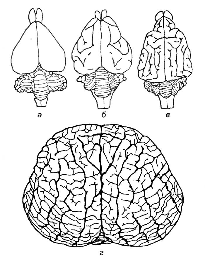 Центральная нервная система у млекопитающих развита больше, чем у какой-либо другой группы животных. Основными отличиями строения мозга млекопитающих от мозга рептилий и птиц являются крупные парные полушария переднего мозга, которые у высших зверей формируют борозды и извилины.
