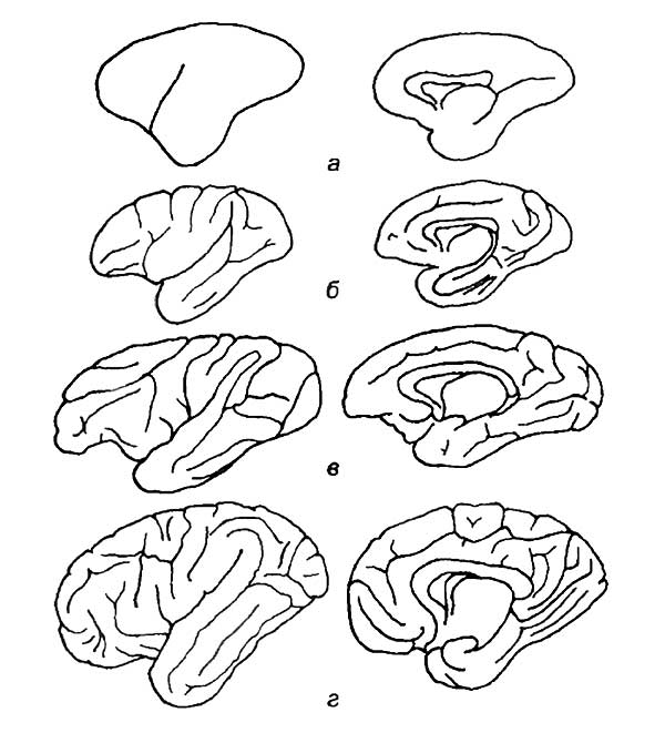 Полушария переднего мозга млекопитающих разрастаются вбок и кзади, покрывая собой промежуточный мозг, часто также средний мозг, а у человека и продолговатый мозг (рис. 27). Полушария переднего мозга имеют неправильную овальную форму и более или менее расширены сзади. У многих млекопитающих, принадлежащих к самым разнообразным группам (насекомоядные, грызуны, зайцеобразные), полушария гладкие, без признаков борозд и извилин. У большинства высших млекопитающих в коре формируются борозды и извилины (см. рис. 27). Однако извилины бывают в различной степени развиты даже в пределах одного отряда. Низшие приматы практически лишены борозд и извилин, тогда как у высших приматов их строение значительно сложнее (рис. 28). С увеличением размеров полушарий непосредственно связано появление мозолистого тела — обширной зоны волокон, соединяющих левое и правое полушария. Это образование характерно для мозга млекопитающих. Промежуточный мозг полностью скрыт полушариями переднего мозга. В нем хорошо развит эпифиз, а воронка, как и у всех позвоночных, завершается крупным гипофизом. Он выполняет преимущественно нейроэндокринные функции, в частности для регуляции сезонной, суточной и половой активности млекопитающих.