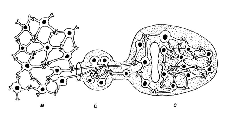 Эти данные свидетельствуют не только о глубоких различиях, но и о сходстве развития и организации нервной системы позвоночных и беспозвоночных. Реконструируя пути усложнения морфологической организации мезга, можно предположить следующую последовательность событий. На первом этапе исторического развития нервной системы произошло появление чувствительных элементов из клеток эктодермального зачатка (рис. 5,а,б). Специализированные клетки эктодермы одновременно обладали сенсорными и эффекторными функциями. Они рецептировали сигнал, проводили его к эффектор-ным органам и запускали их реакцию. Эти клетки были связаны между собой и формировали непрерывную сеть, которая не имела выраженных центров (рис. 5,в). Такой тип организации нервной системы мы встречаем у кишечнополостных. При появлении более сложных поведенческих задач элементы нервной системы стали объединяться в небольшие скопления. По-видимому, это происходило двумя путями. С одной стороны, формировались «параллельные ганглии» (рис. 5,г), для которых характерны синаптические контакты между телами клеток. Этот примитивный тип концентрации нервных элементов характерен для свободноплавающих кишечнополостных.