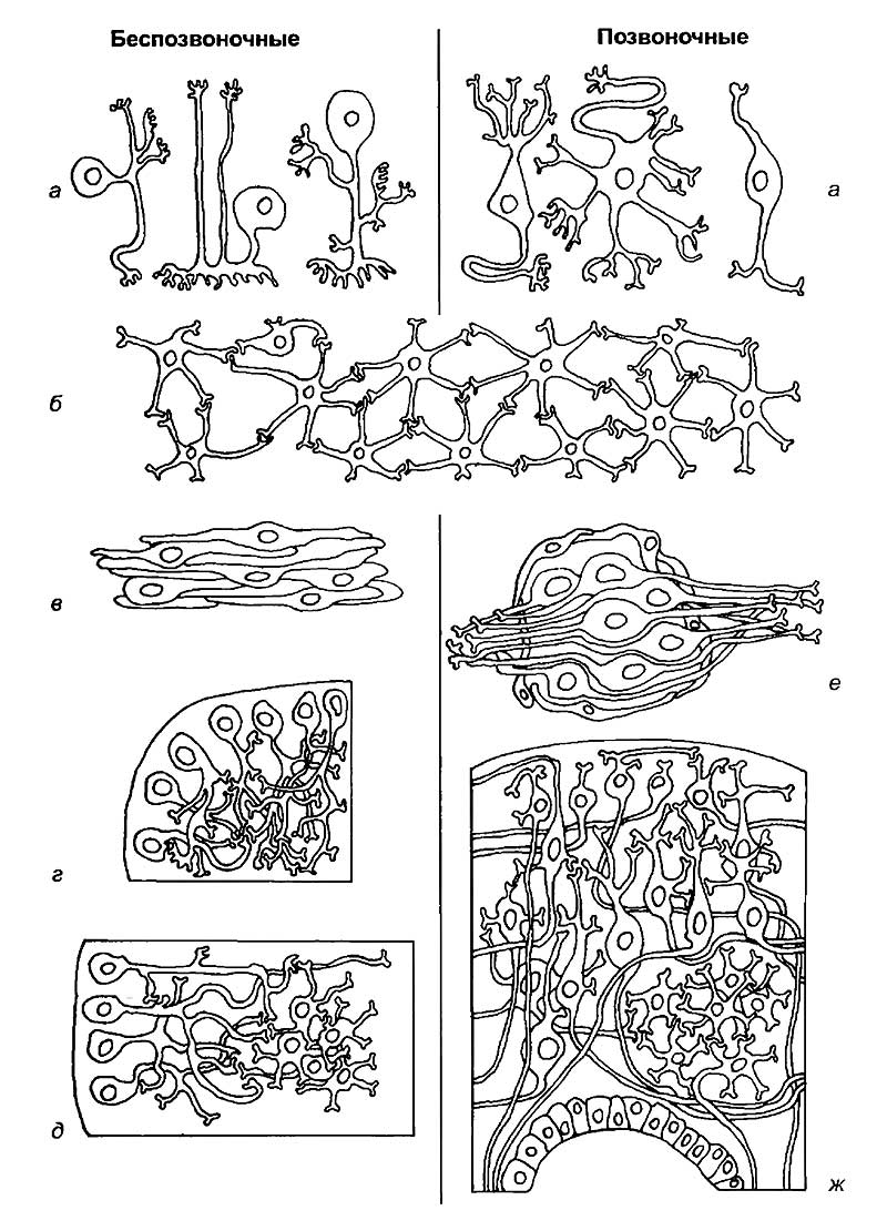 Нервные клетки в обеих группах не имеют принципиальных различий в цитологической организации (см. рис. 4), хотя некоторые особенности в строении отростков и тел клеток могут быть предметом исследования сравнительной цитологии. В самом простом случае нервные клетки образуют диффузную сеть, характерную для обеих групп (см. рис. 4,б). В ганглиях беспозвоночных и нервной трубке позвоночных клетки и их отростки расположены закономерным образом. К первому типу организации нервных клеток беспозвоночных следует отнести их способность формировать «параллельные ганглии» (см. рис. 4,в). Эти структуры характеризуются однонаправленным вытягиванием тел нейронов и формированием контактов между параллельно лежащими отростками.