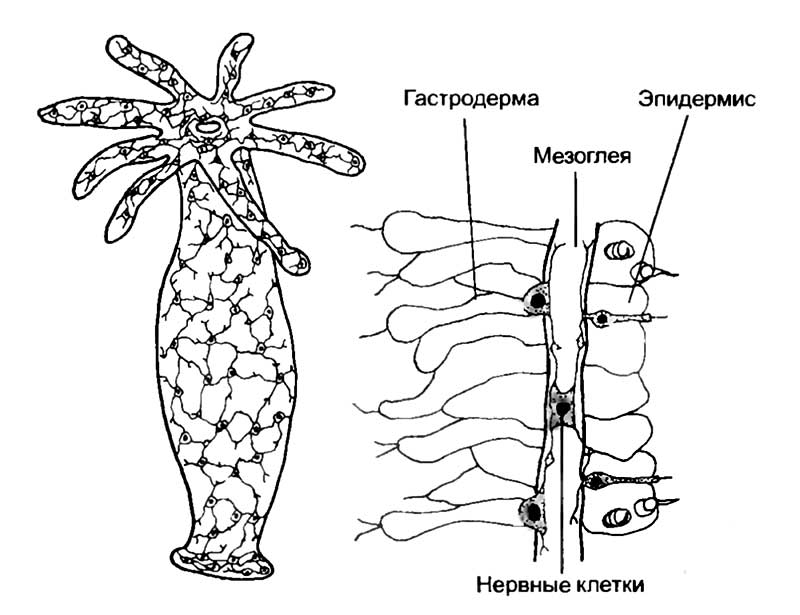 Для гидры характерна диффузная нервная система с плотным расположением нейронов на подошве и у ротового отверстия. Увеличен фрагмент стенки тела гидры с закрашенными нервными клетками, которые расположены в мезоглее и на границе гастродермы и эпидермиса.