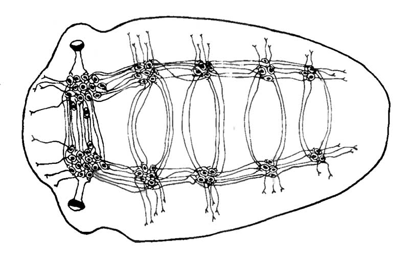 У плоских червей нервная система централизована менее всего. Два боковых нервных ствола тянутся у них вдоль всего тела от переднего конца к заднему (см. рис. 7). Боковые стволы соединены поперечными нервными пучками, а в зонах пересечений расположены тела нейронов. В общем виде нервная система плоских червей напоминает лестницу. Поэтому удачное название «лестничная нервная система» сохранилось до настоящего времени. Нервная система плоских червей расположена ближе к брюшной стороне тела, так как на ней сильнее развита мускулатура и она постоянно раздражается, соприкасаясь с субстратом, по которому ползет червь. К переднему концу тела размеры нервных стволов увеличиваются. В головной части червя расположен мозг, который состоит как из брюшных, так и из спинных скоплений нервных клеток.