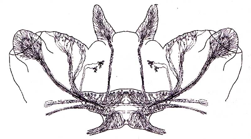 В этот момент значительным изменениям подвергается центральная нервная система насекомых (рис. 11). Так, например, у почти безногих личинок дровосека грудные узлы практически одинаковы по размерам с брюшными и незначительно отличаются по функциям. Среди этих ганглиев по размерам и функциям выделяется только головной мозг. У взрослого жука с развитыми ножными и крыловыми мышцами разница между узлами очень значительна. Во время метаморфоза происходит объединение нескольких грудных ганглиев личинки в один крупный ганглий взрослого жука.