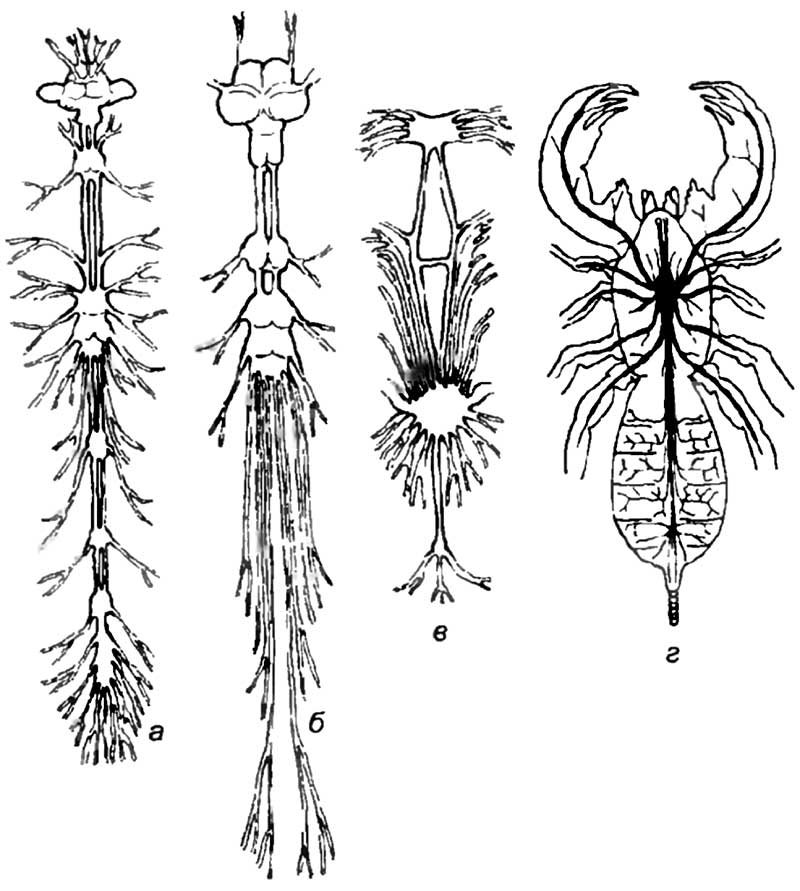 б — ганглиозный тип организации нервной системы, который характерен для червеобразных, моллюсков и членистоногих;