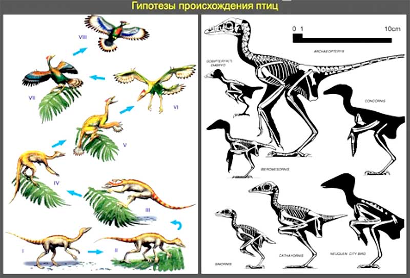 Значит возникает два вопроса. Какой биологический смысл объясняющий появление тех находок – здесь фрагменты скелетов показаны с правой стороны – которые бы помогли нам понять происхождение тех самых птиц.