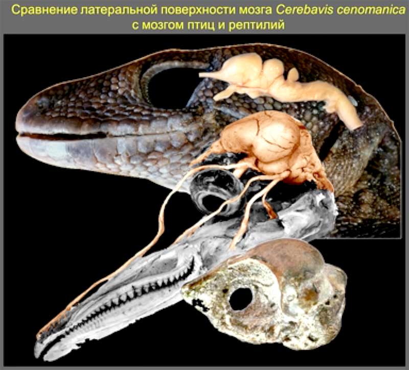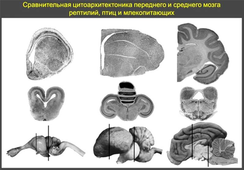 Это такие эмоционально-гормональные существа, которые не столько думают, сколько считывают эмоциональные сигналы, чтобы принимать те или иные решения по поведению. Есть материал, довольно ограниченный по архаичным птицам, который можно сопоставлять с современными птицами. Имеется в виду – внизу картинка Cerebavis-а, то есть чистый мозг достаточно архаичной птицы, около 80 с лишним миллионов лет назад, повыше – эта птица современная, гусь, а верху – рептилия [геккон].