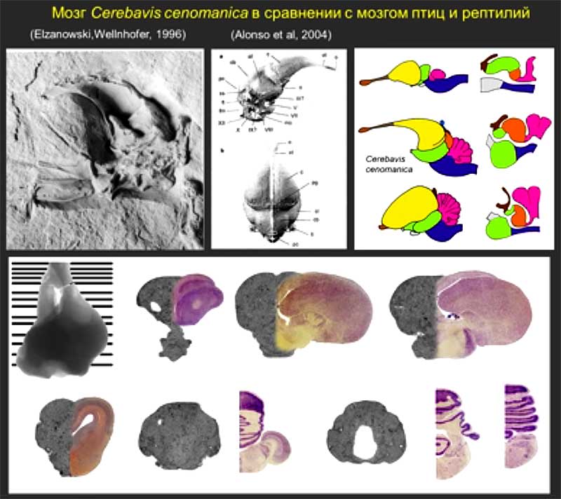 В чём дело? Если сопоставлять древнейших птиц, и начиная с археоптерикса – а его мозг относительно не так давно, в 2004-м, дополнительно исследован – то окажется, что есть некоторые конструкционные препятствия. Которые говорят – от рептилий идут пути к птицам, которых мы рассматривали? – или нет? Оказывается что – нет.