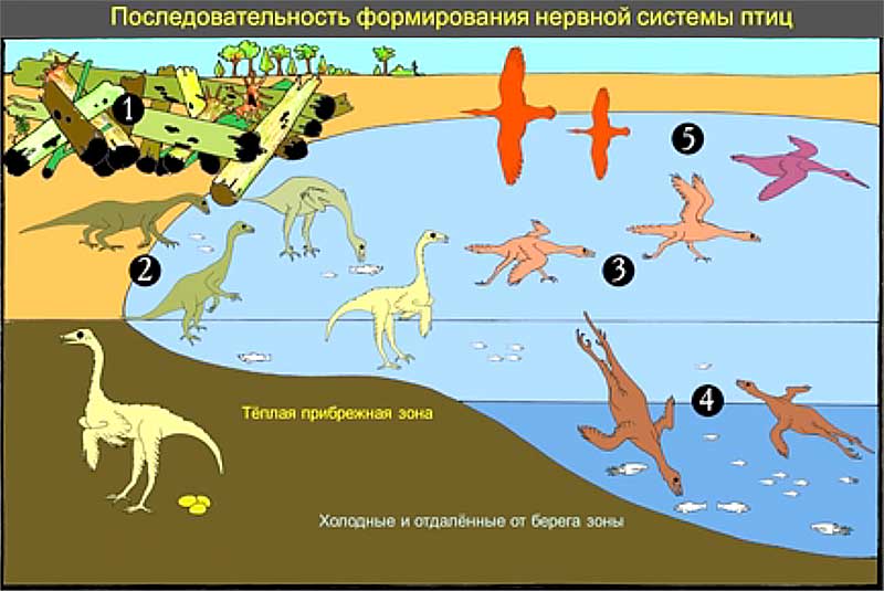 Собственно говоря вот эта концепция и легла в основу нашего предположения, которое сейчас подтверждено как с точки зрения особенностей строения скелета некоторых архаичных существ, так и с точки зрения следов неврологической специализации, в том числе и дыхания особенностей, и скелета, и – самое главное – специализации мозга. В котором, как вы знаете, у птиц практически рудиментарно обоняние основное – только у некоторых видов. А вомероназальный орган полового обоняния – так развитый у рептилий – вообще отсутствует. Что, собственно говоря, и легло в основу этой концепции.