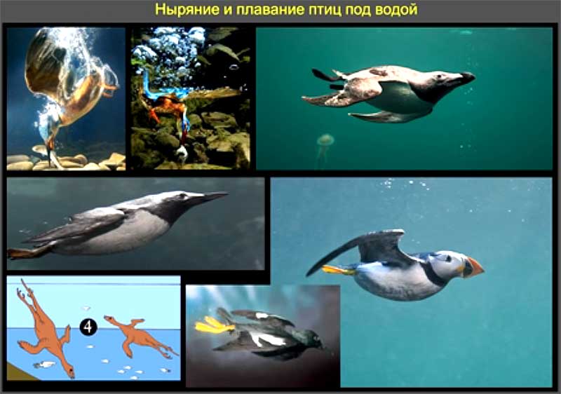 Но кроме этого мы имеем современных – около 150 видов птиц – которые отлично плавают под водой. Здесь картинки статичные, сейчас мы перейдем к картинкам не статичным.