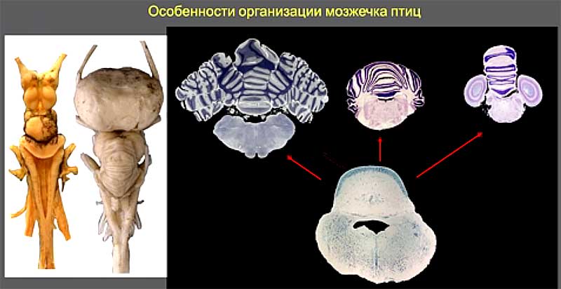 При этом плавание под водой очень однозначное. Оно говорит о том, что тот рептилийный мозжечок, который позволяет ориентироваться в трехмерной среде – он внизу справа – он у нас превратился – в связи с лазанием по деревьям и такого сложного разнообразного движения – в картинку слева и посередине, а у птиц только остался червь мозжечка, связанный с достаточно примитивными движениями. То есть это рептилийный раздутый до пределов мозжечок, который характерен в том числе и для пелагических акул, (которые слева).