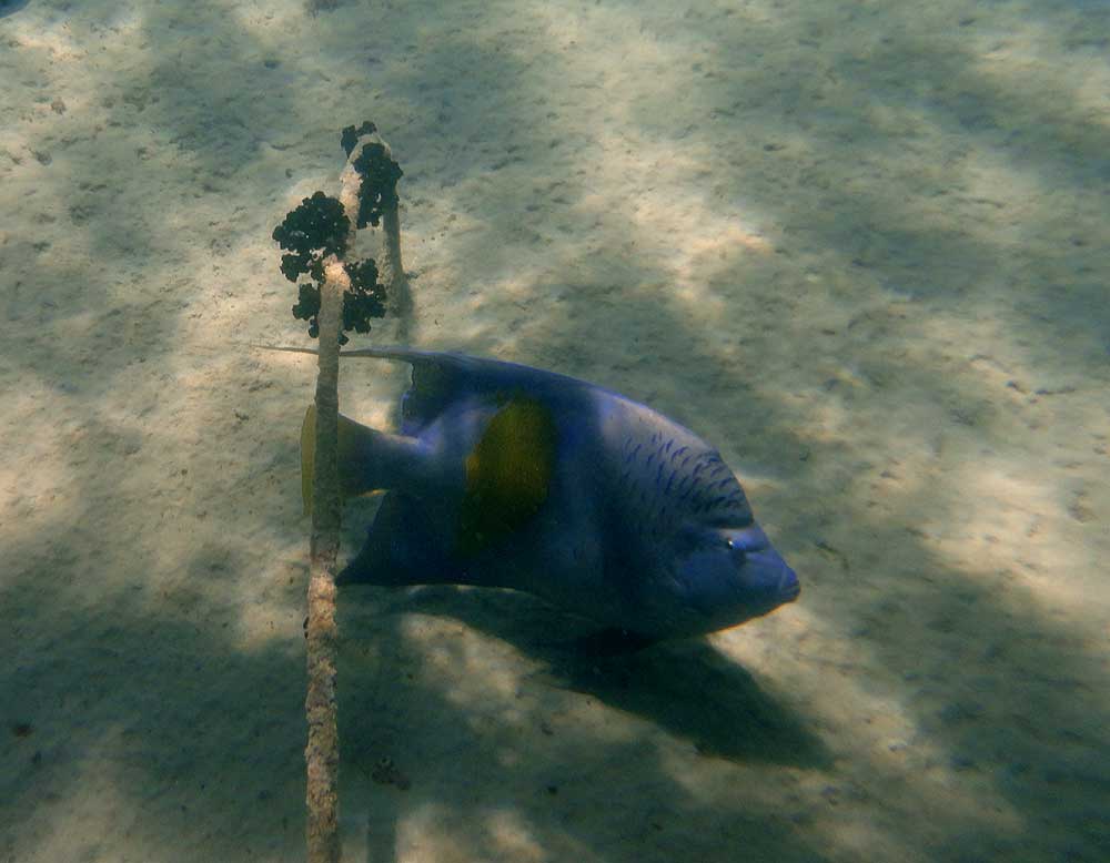 Это так сказать рыба у лестницы: аравийская рыба-ангел, а на входе, с другой стороны мостков на глубине под клубом крылаток ходит императорская рыба-ангел... :о) Под мостками есть что посмотреть, как обычно!
