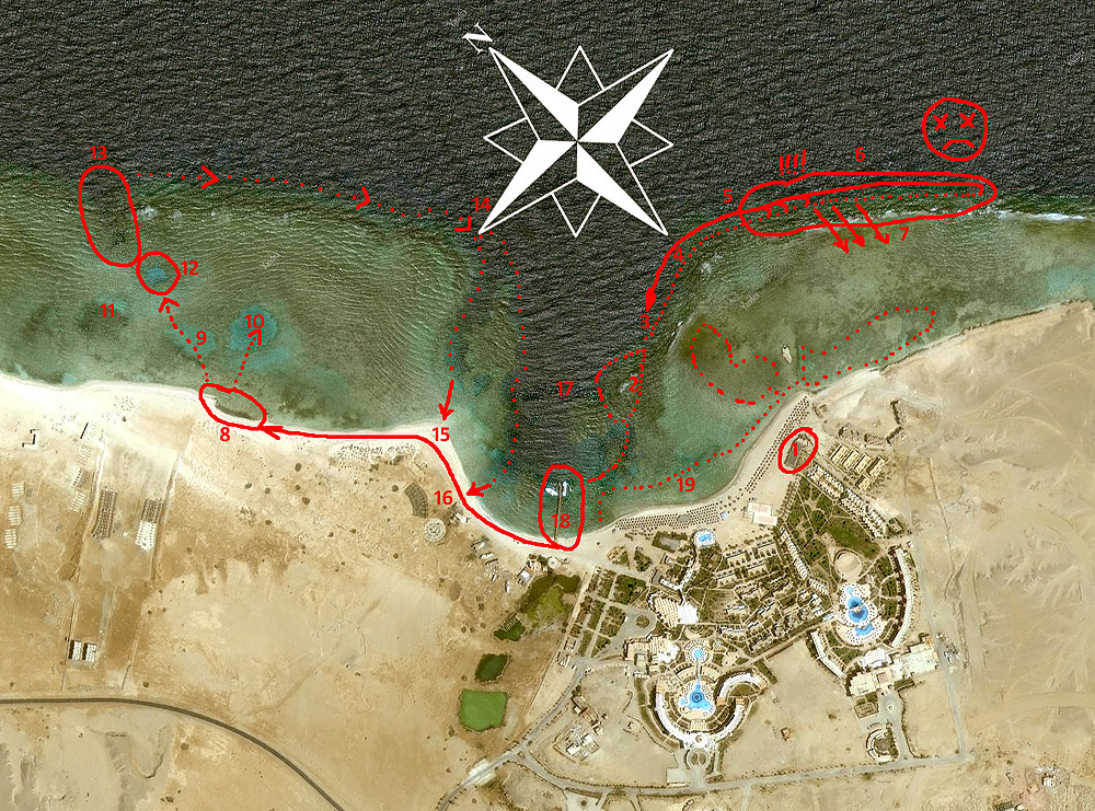 С правой стороной рифа у нас была проблема: течение вдоль рифа реальное, возвращаться против течения — трудная прогулка издалека, даже в ластах, а удобного выхода на мелководье из точки 6 мы так и не нашли...