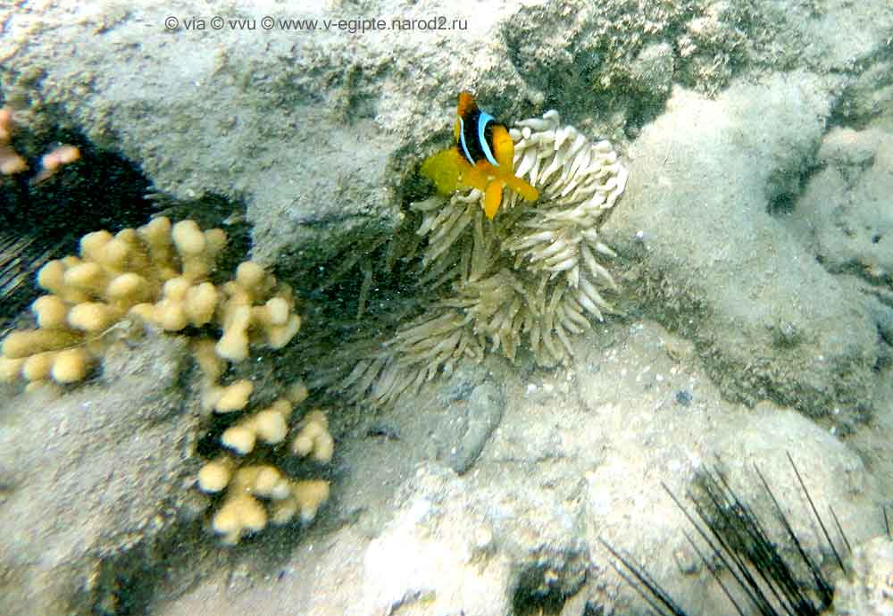 Тем не менее там есть риф, он замучен, но заселён. На линии 1-2 с мостков мы видели ската и мурену. Прямо напротив мостка (1) в рифе за узким песчаным участком для купания живёт клоун, ревностно защищающий от посетителей свою актинию. Очень трогательный :о)