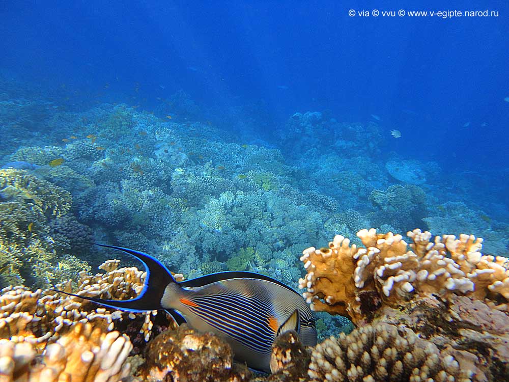 Вот в этом месте рифа есть как бы проход между двумя рифовыми кустиками. В этом месте постоянно обитают две рыбы-бабочки и хирург. И вот этот хирург с необычайным рвением защищал проход от других хирургов и меня :о) К рыбам-бабочкам он совершенно спокоен. Они — свои. К жене — тоже :о) А меня он день ото дня пытадся прогнать, нападая и стараясь стебануть или сделать вид, что собирается стебануть по лицу хвостом. Это забавно, но вообще-то сбоку на стебле хвоста у него имеется гребень из ярко-оранжевых шипов, а подплывал он действительно вплотную.