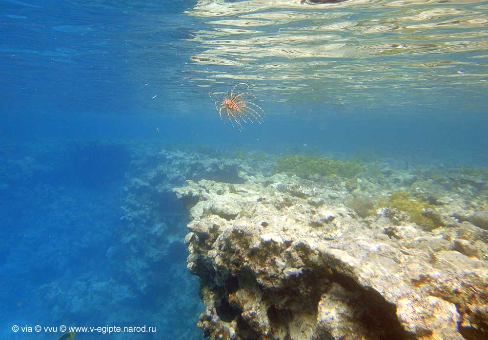 В точке (3) проходит как бы граница бухты, высокий риф заворачивает на право, а прямо и налево идёт гряда более глубокого рифа в сторону островка. Символизировала эту границу верёвочка с оторванным поплавком для заякоривания прогулочных катеров — сюда привозят туристов для погружений.