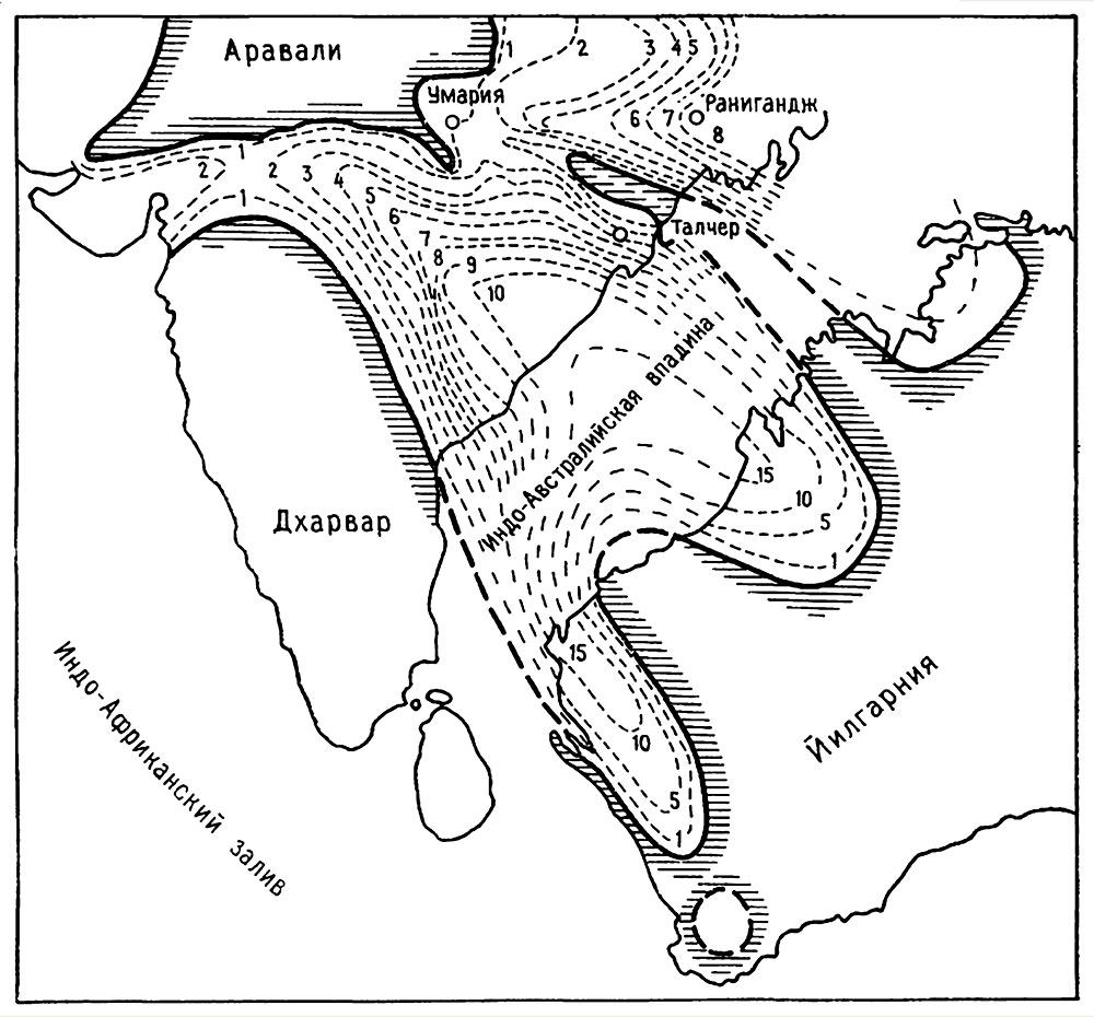 Рис. 31. Выполненная проф. Ахмадом реконструкция палеогеографии Индо-Австралийской зоны для пермского периода. Цифры на изолиниях указывают мощность накопившихся отложений (в тысячах футов). Бассейн осадконакопления все время был неглубоким и неморским, но его днище постоянно погружалось, до 3 км в его центральной части, что привело к пяти эпизодам временного вторжения моря.